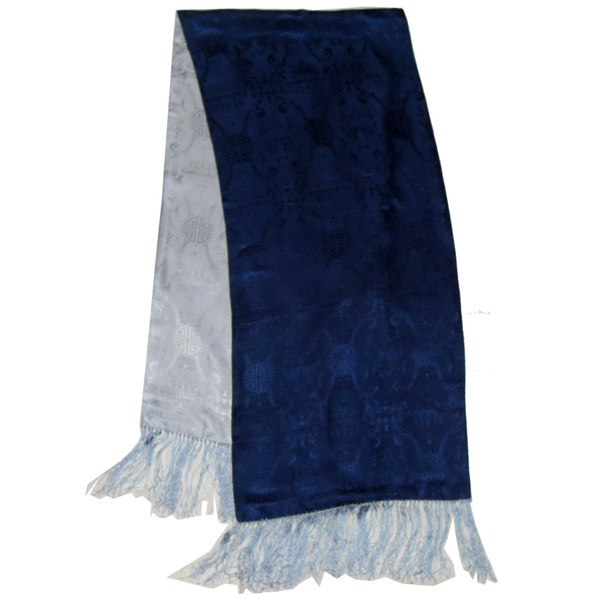 Long Japanese jacquard silk scarf with hand tied tassel ends, one side is dark blue and one side is light blue. Measures 14″ (37cm) wide x 78″ (199cm) long with tassels.