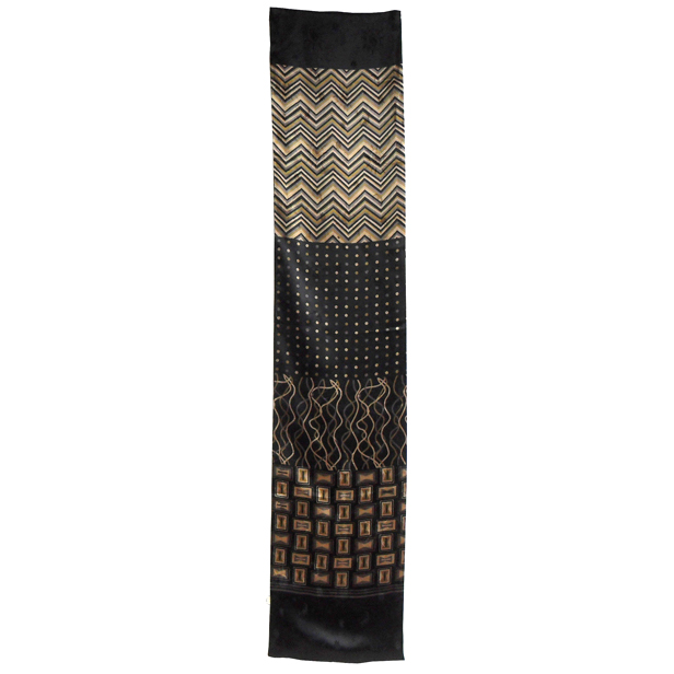 Long silk satin scarf in textured silk with a suns and stars design on the texture and a design in browns and golds of spots, squares and squiggles. Measures 52″ (134cm) long x 10.5″ (27cm) wide.