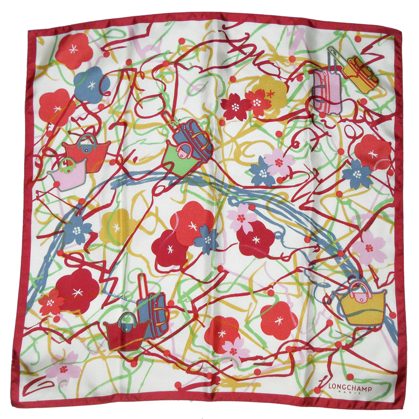 Longchamp Paris small silk square scarf with a design of handbags and flowers. Measures 19″ (49cm) x 19″ (49cm).