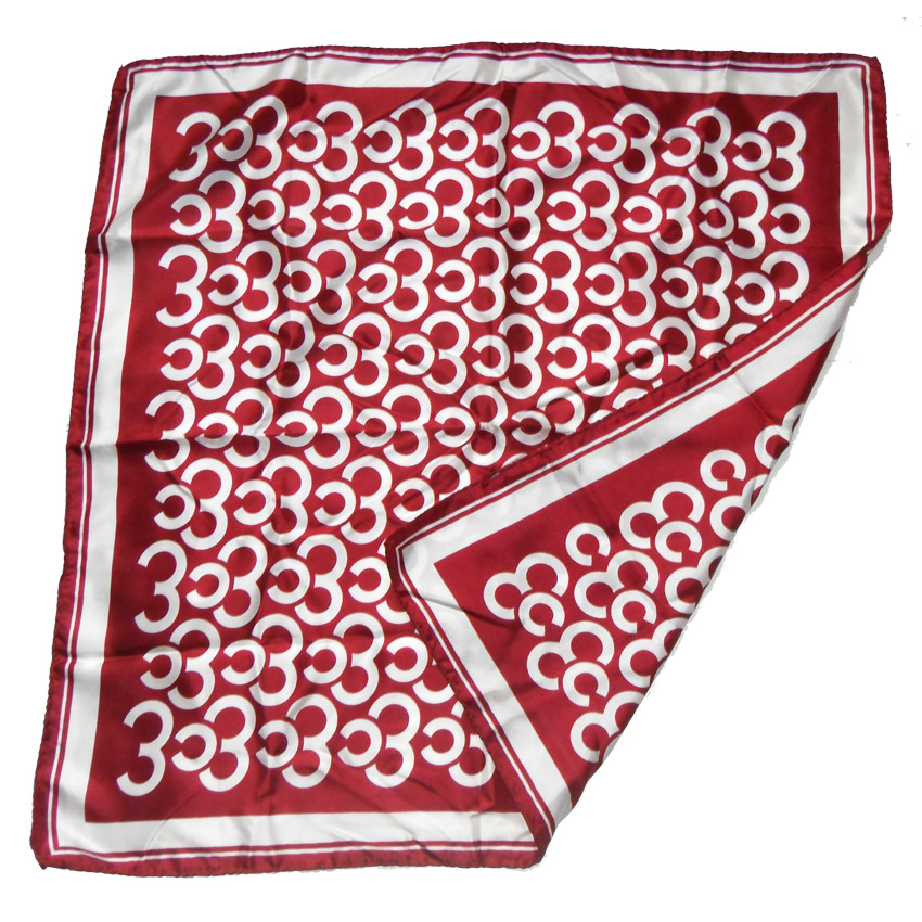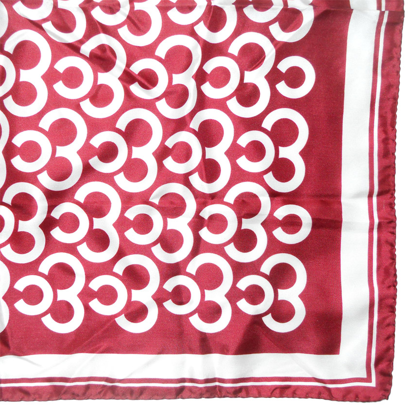 Silk scarfwith a maroon background and white design and hand rolled edges.  Measures 27″ (68cm) x 27″ (68cm)