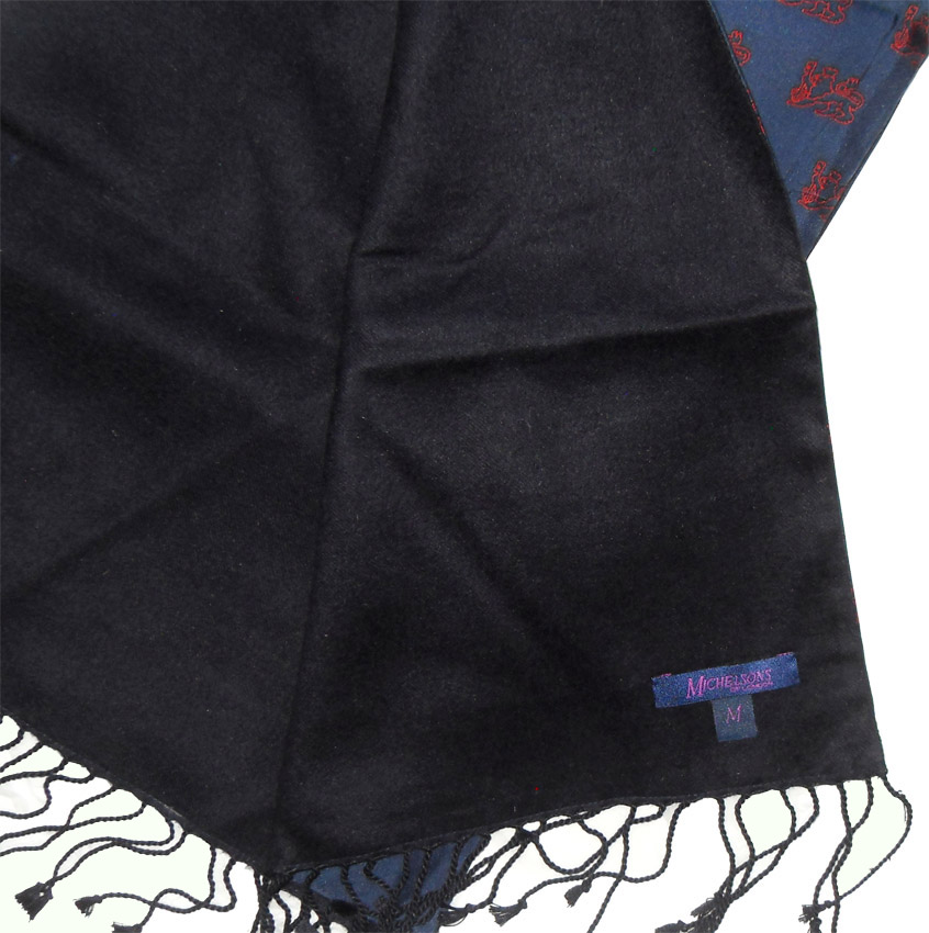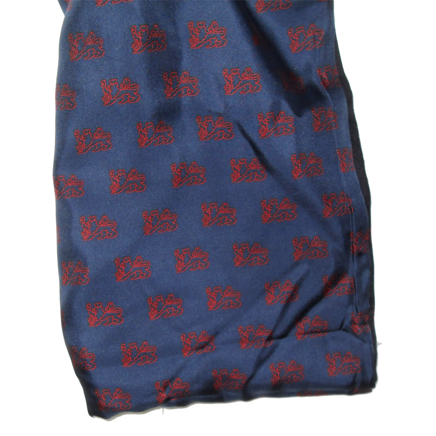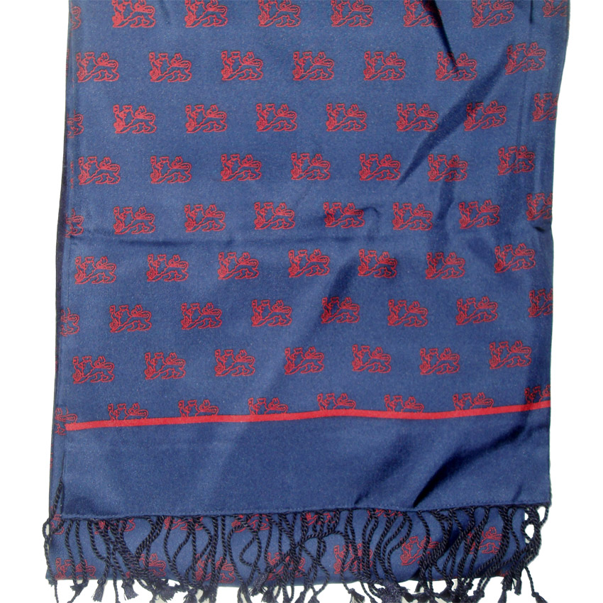 Michelsons of London long silk and wool scarf with a British Lion design in re red on a dark blue background on the silk side. Measures 63″ (160cm) long without the fringe ends x 12″ (30cm) across.