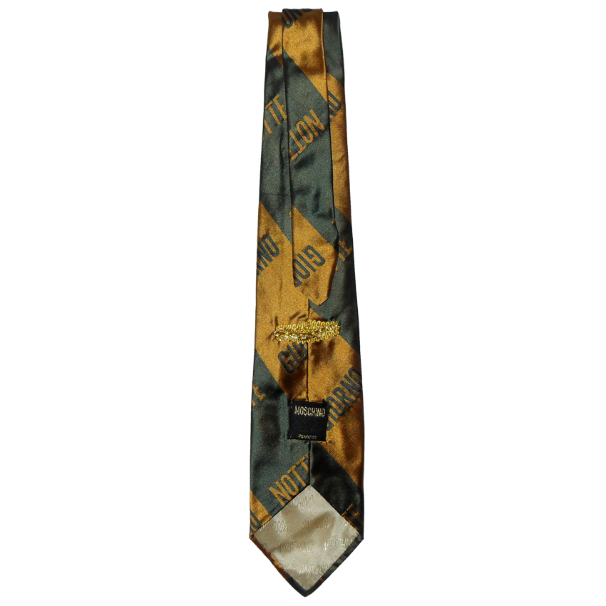 Moschino Notte Giorno design green and gold silk tie.
