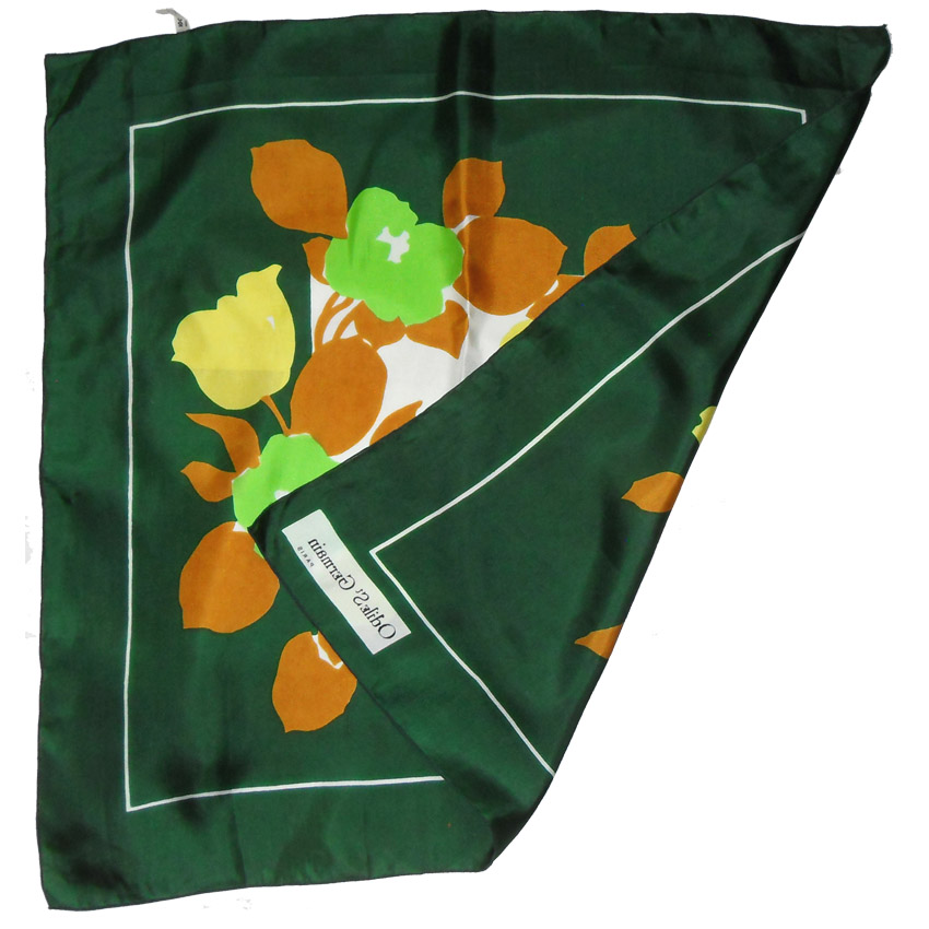 Vintage Odile St Germain, Paris, silk scarf with a green background and an abstract flower design. Measures 25.5″ (65cm) x26″ (66cm).