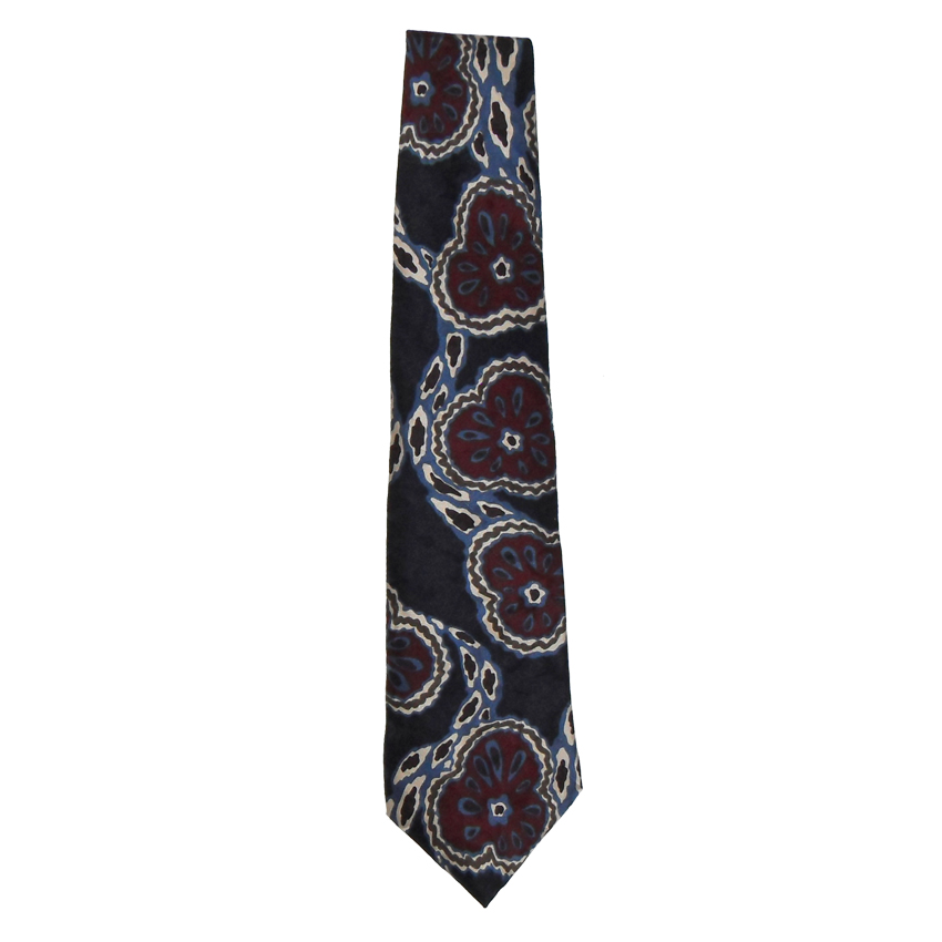 Oscar de la Renta couture collection silk tie with a vibrant design on a dark blue textured silk background.