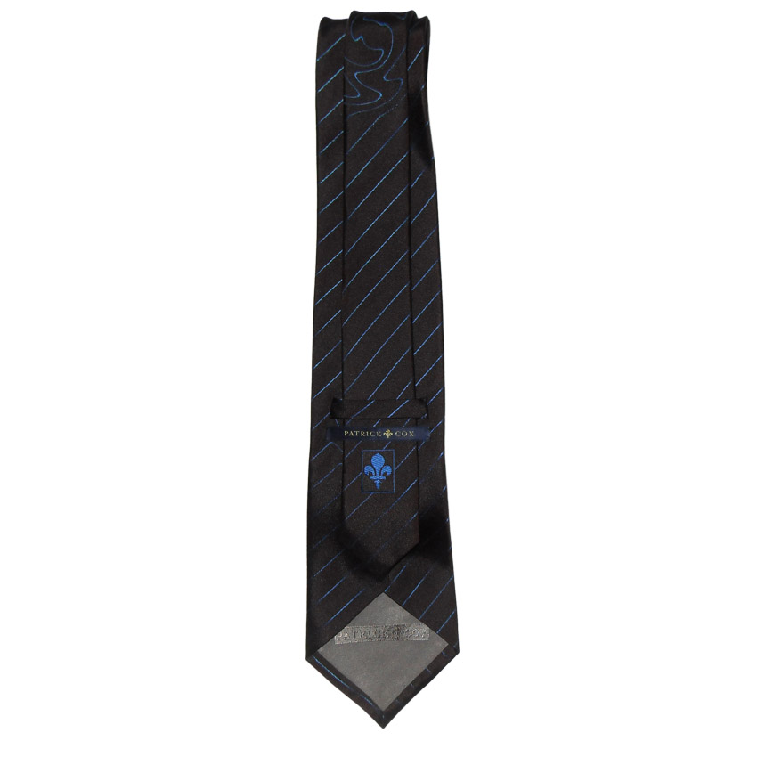 Patrick Cox silk tie with a black background and electric blue design