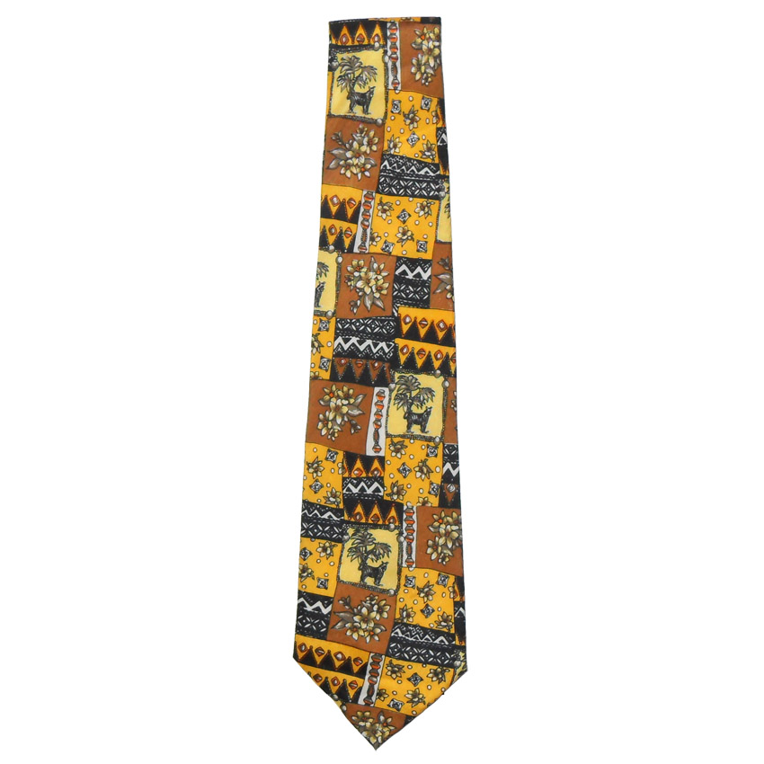 Pictorial silk tie with a design of a tiger, a tree, flowers and various decorations in shades of yellow, brown, black and white.