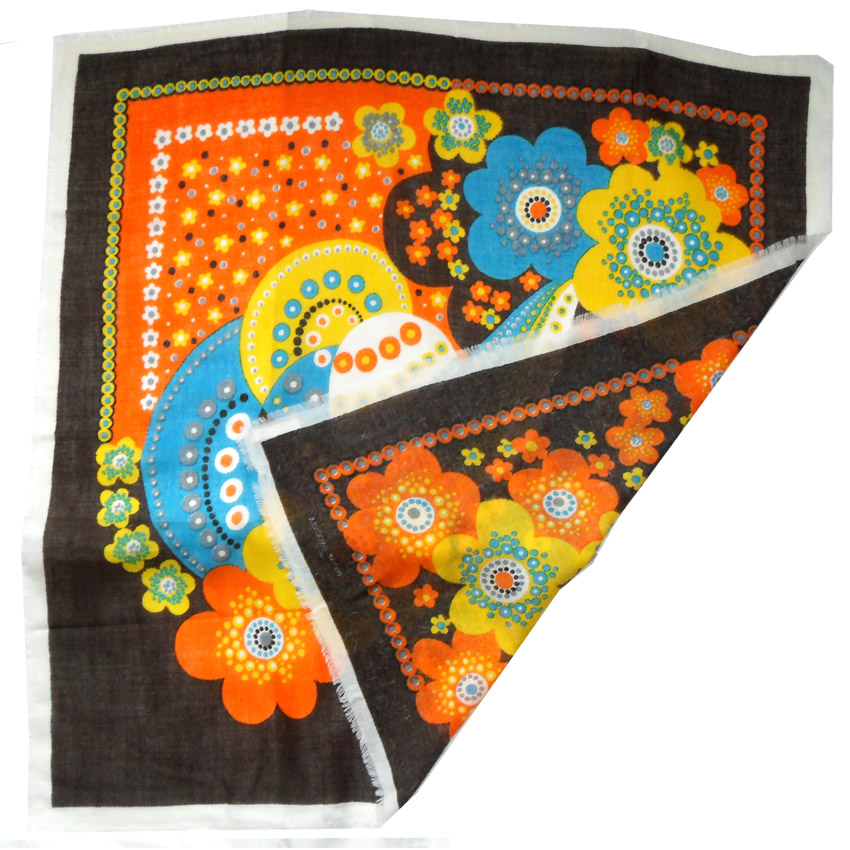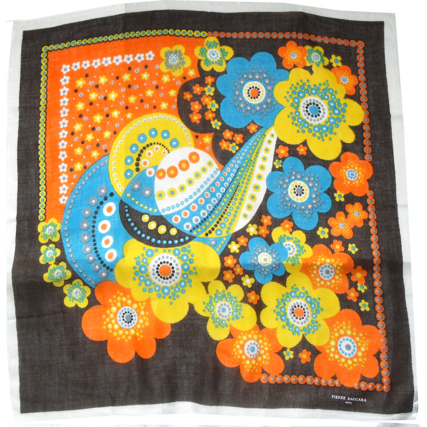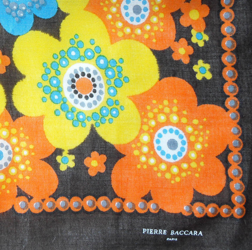 Pierre Baccara Paris scarf which has a white border, a dark brown background and a colourful pop art flower design in bright yellow, orange, blue and white. Measures 31.5″ (80cm) 32″ (81cm). This scarf is 75% wool, 15% angora and 10% nylon.