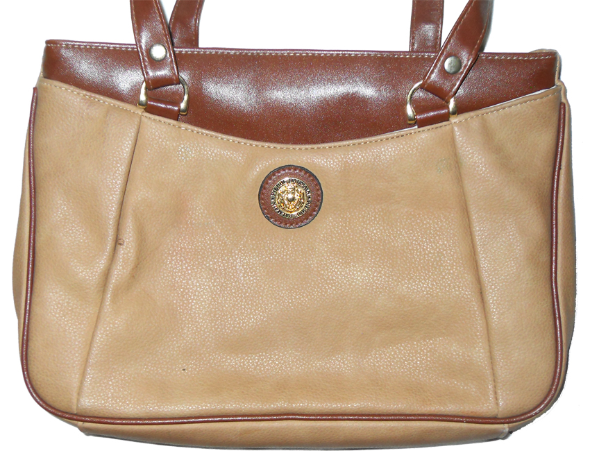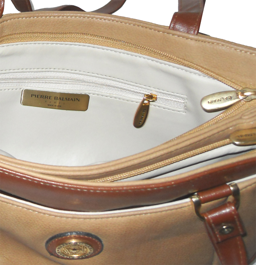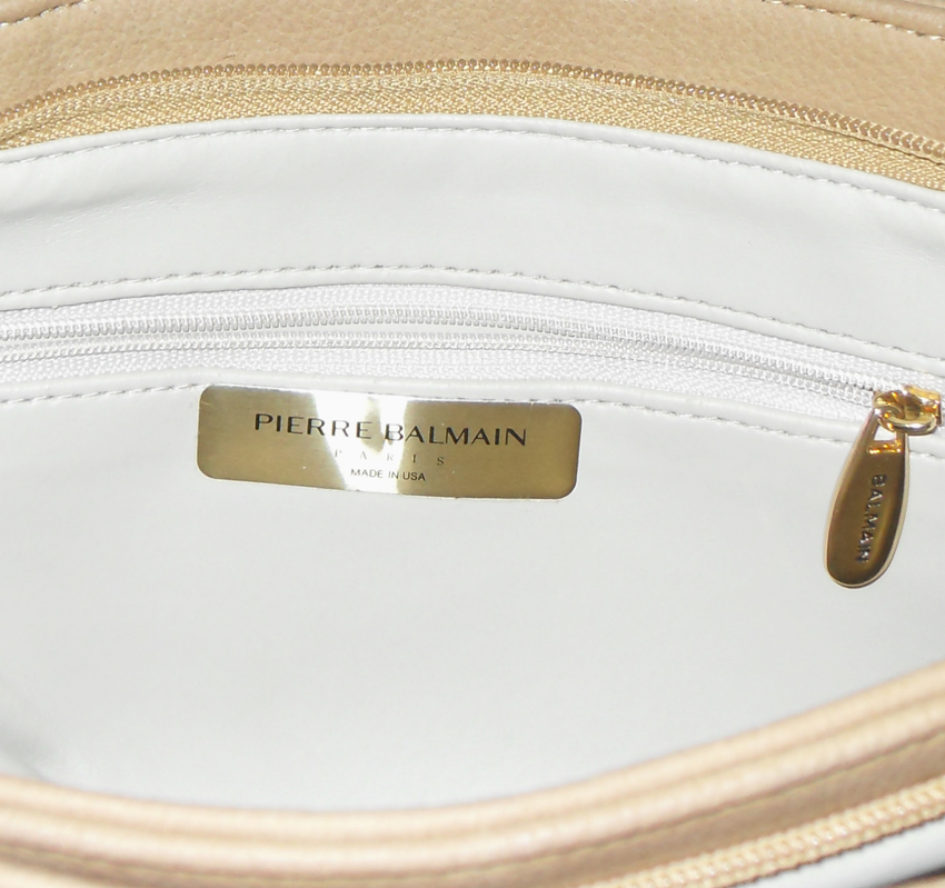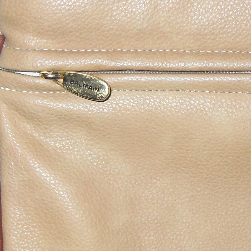 Vintage Pierre Balmain light brown leather shoulder bag, made in USA, with the designer’s name on the front decoration in gold tone metal. This bag has two zip closure compartments which are lined in cream leather, one of which has a small zip pocket. There is also a zip pocket at the back of the bag. Measures 13″ (33cm) x 9.5″ (24cm) without shoulder straps.