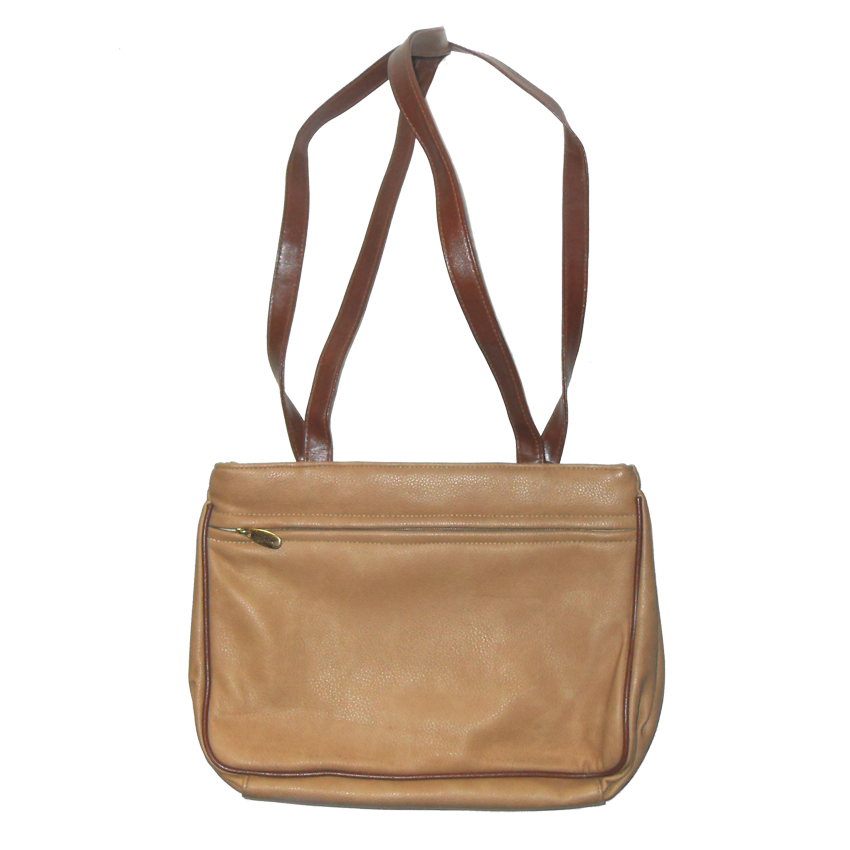 Vintage Pierre Balmain light brown leather shoulder bag, made in USA, with the designer’s name on the front decoration in gold tone metal. This bag has two zip closure compartments which are lined in cream leather, one of which has a small zip pocket. There is also a zip pocket at the back of the bag. Measures 13″ (33cm) x 9.5″ (24cm) without shoulder straps.