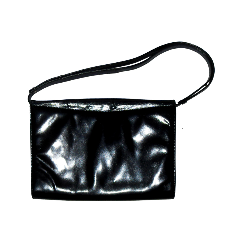Pierre Balmain 1980s black leather handbag with an adjustable carry handle, lined in black grosgrain fabric with an inside zip pocket. Measures 11″ (28cm) x 7″ (18cm) without handle. Some small marks to the leather.