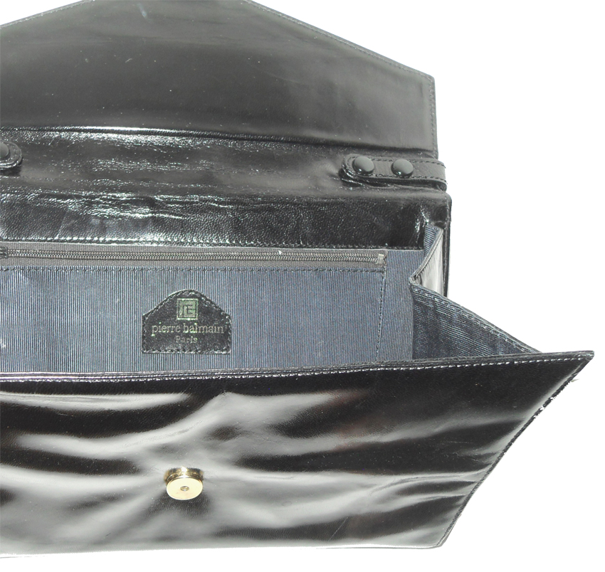 Pierre Balmain 1980s black leather handbag with an adjustable carry handle, lined in black grosgrain fabric with an inside zip pocket. Measures 11″ (28cm)  x 7″ (18cm) without handle.  Some small marks to the leather.