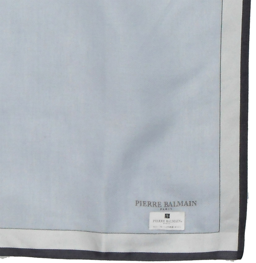 Pierre Balmain light blue and grey cotton pocket square with a dark blue border and the Pierre Balmain name in the corner. Measures 18″ (46 cm) x 18″ (46 cm).