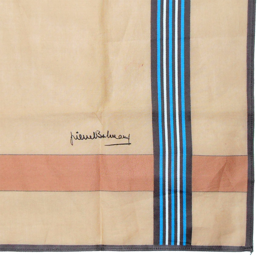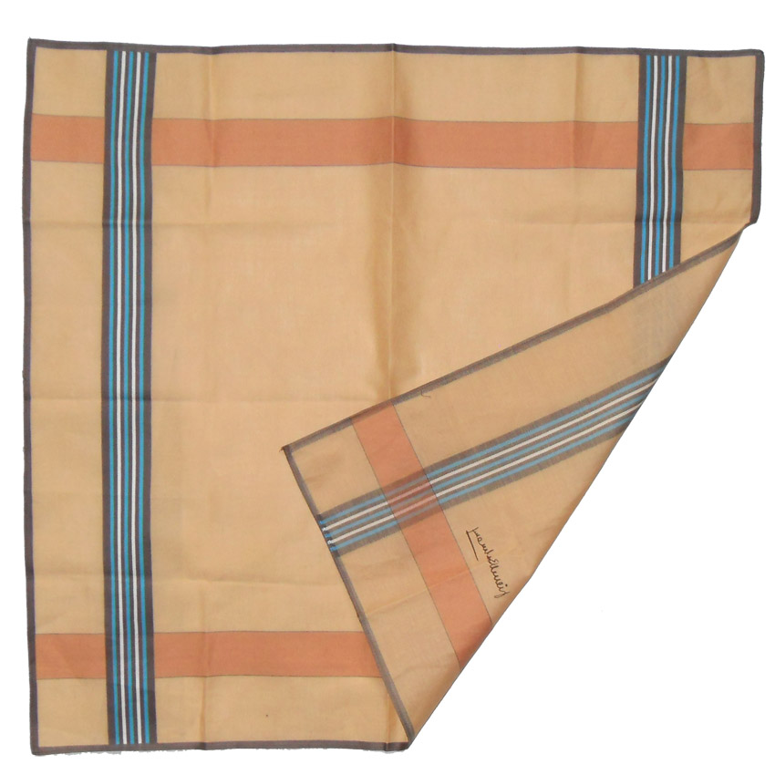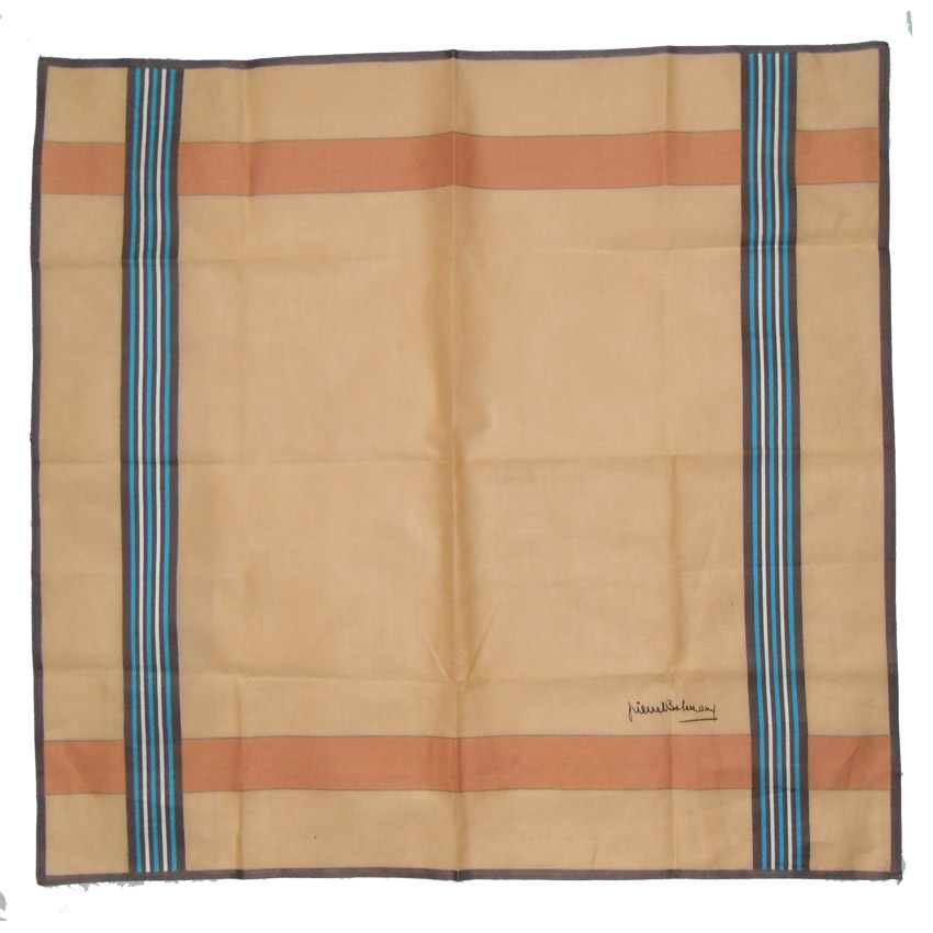 Pierre Balmain cotton pocket square in light orange with a striped borderĀ and the Pierre Balmain name in the corner. Measures 18″ (46 cm) x 19″ (48 cm).