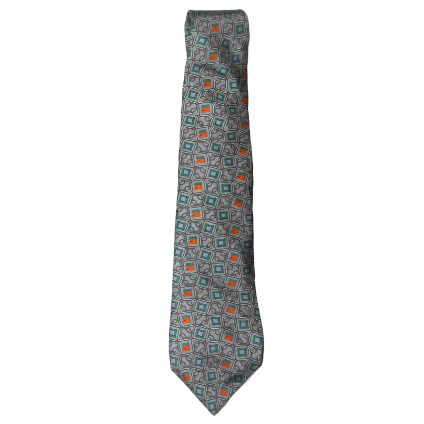 Pierre Balmain vintage silk tie with a silver background and a stirrup design in orange and green.