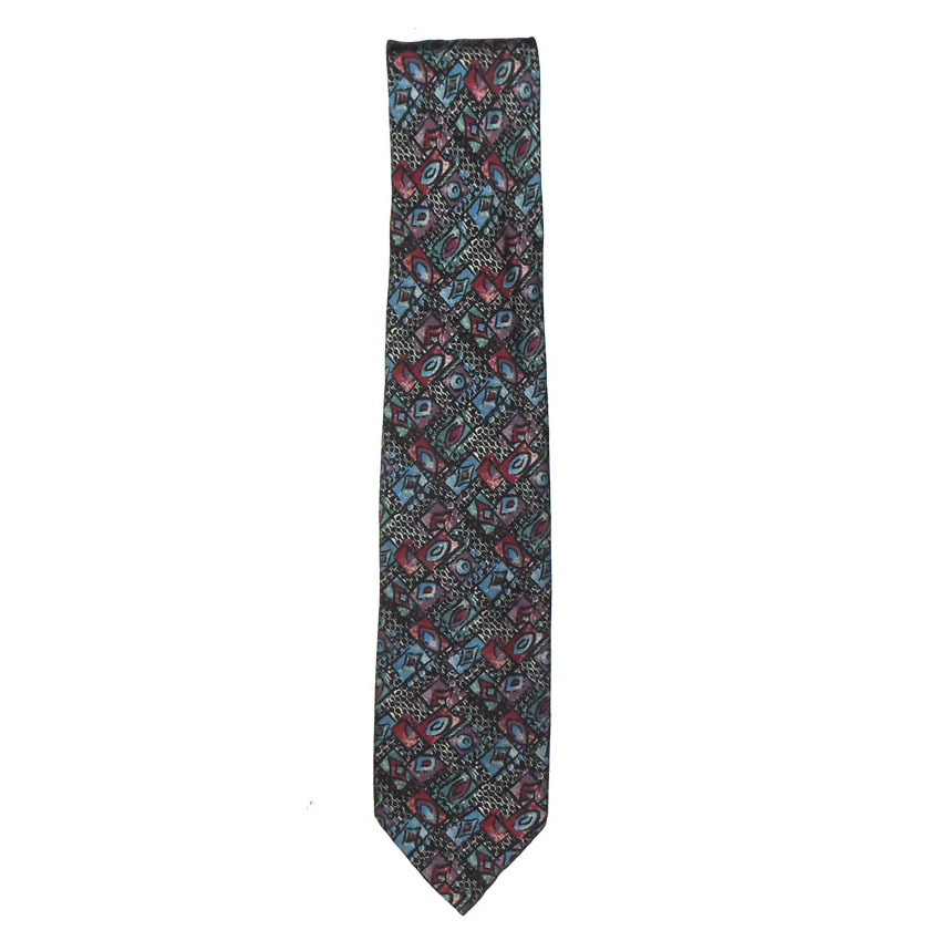 Lovely vintage abstract design silk tie featuring a black and white chain background with a square designwith an oval and diamond design in oranges and blues.