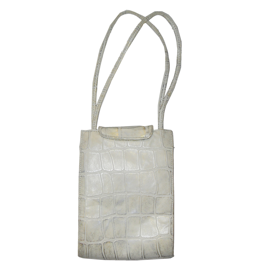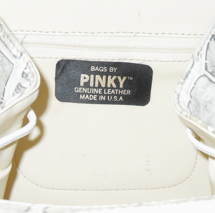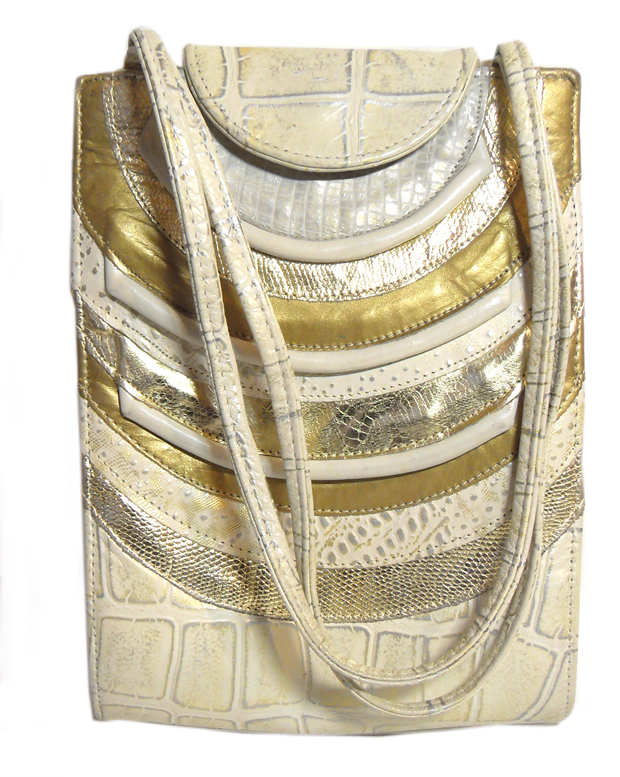 Vintage Pinky USA cream and gold leather handbag. This unusual bag has a small front flap and different textured leathers in creams and golds. It is lined in cream leather and has a small zip pocket inside. It measures 7″ (18cm) x 10″ (26cm) without the handles. There are some marks to the lining.