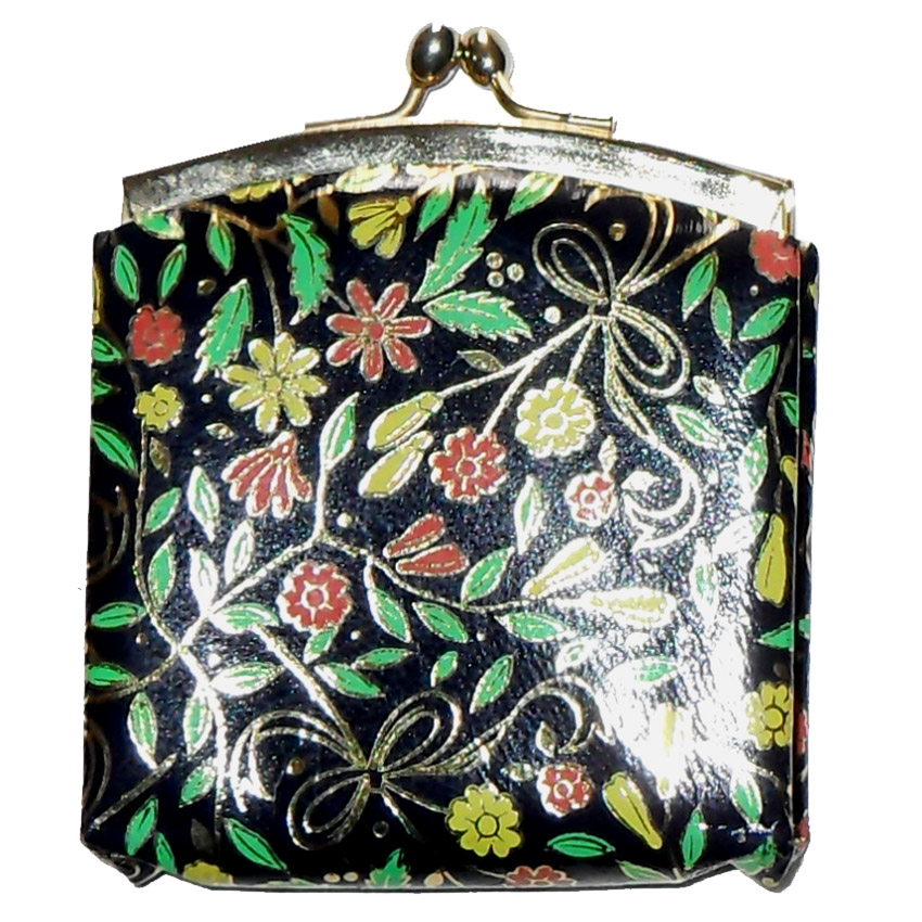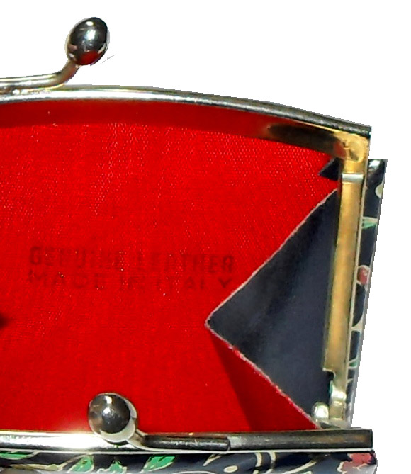 Printed flower design framed leather coin purse with a gold tone frame and clasp and a red moiré fabric lining. Made in Italy. Measures 3″ (8cm)) x 3.25″ (8.25cm).