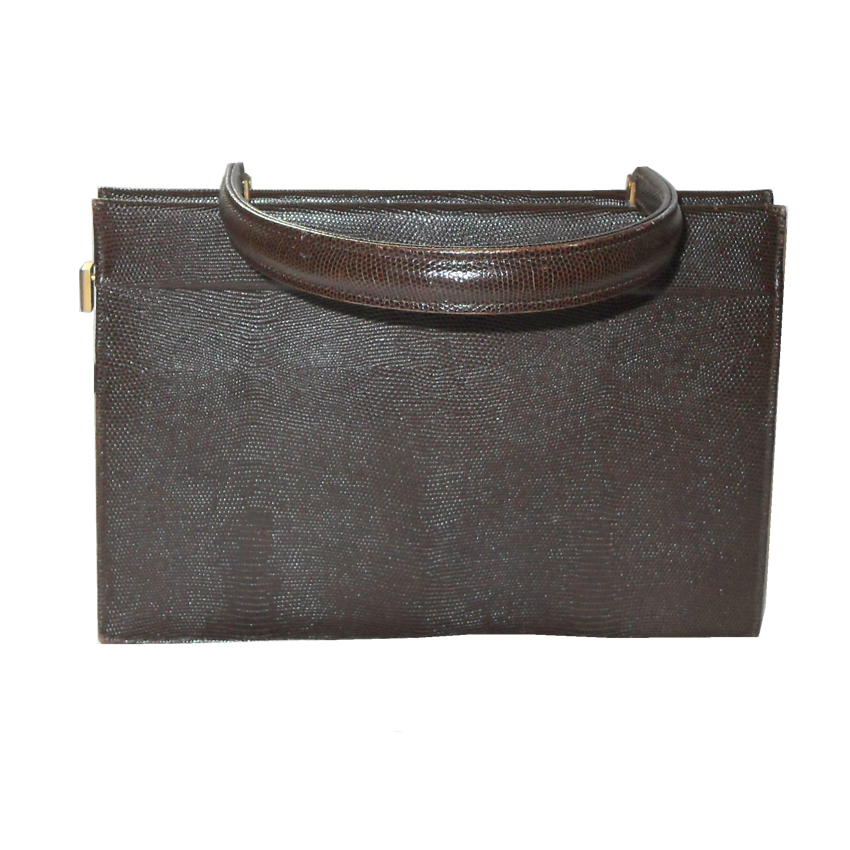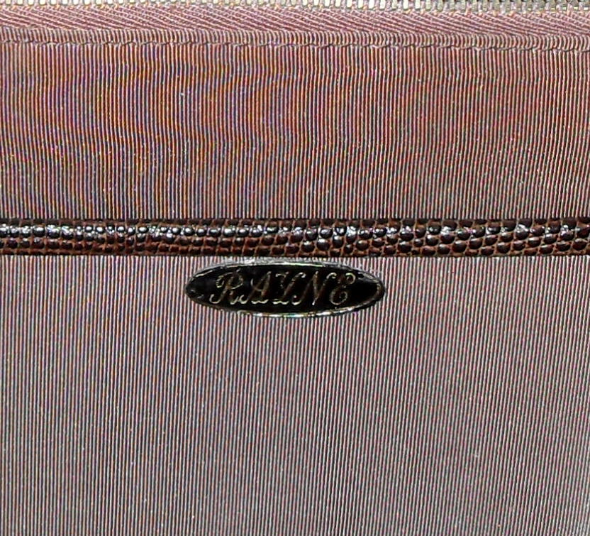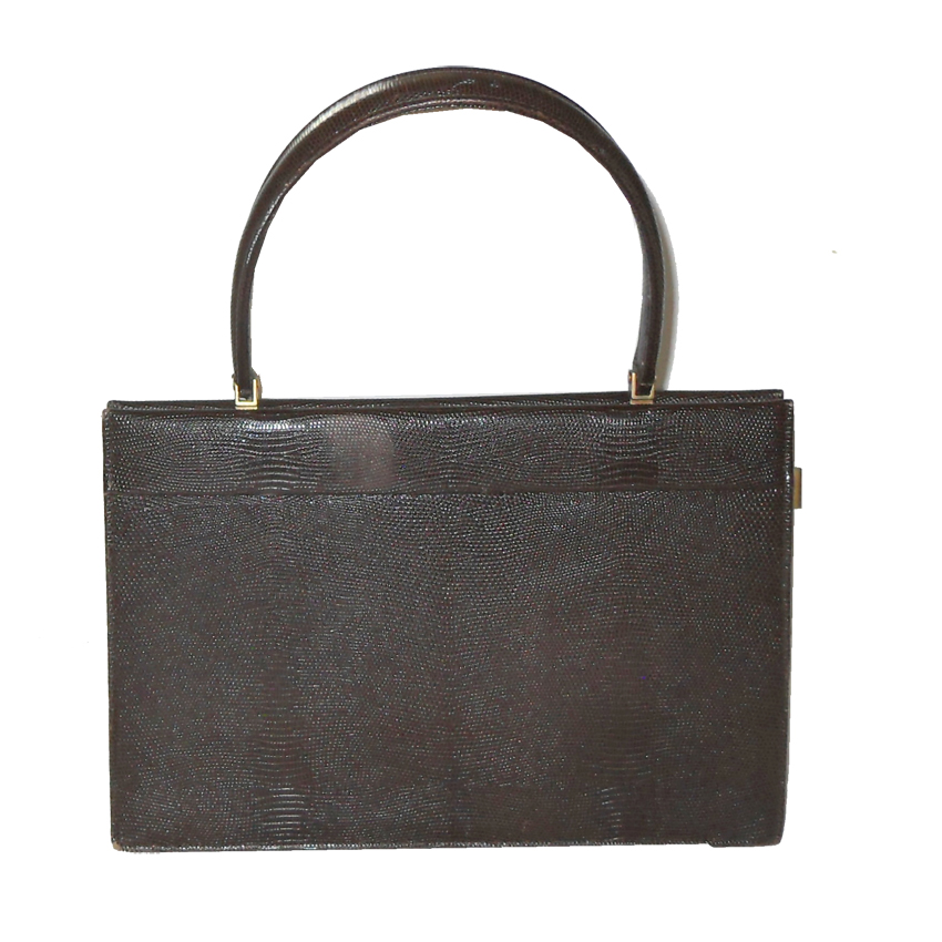 Vintage Rayne, England, dark brown lizard skin large framed handbag with gold tone metal fittings. This handbag has a push button mechanism on the side to open the bag and is lined in brown moiré fabric and has a matching coin purse. Measures 12″ (30cm) x 8″ (20cm) without handle. There is some wear to bottom corners of the bag.