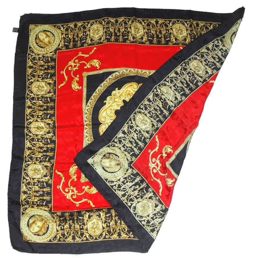 Jacquard silk scarf with hand rolled edges, a black border and a classical design in red and gold.  Made in Italy. Measures 35″ (89cm) x 34″ (86cm).