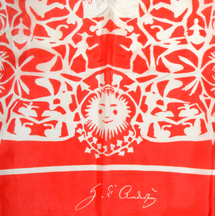 Red and white design silk scarf with hand stitched edges and the artist’ signature. Measures 32.5″ (83cm) x 34″ (86.5cm).