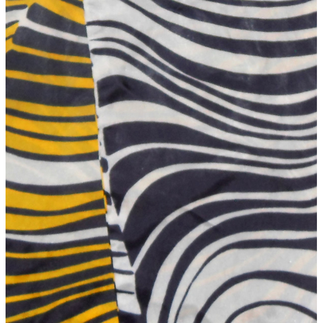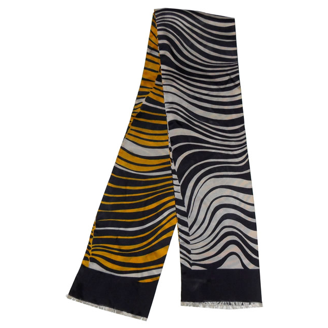 Long animal print scarf which has a design in navy and white one side and yellow, navy and white the other.