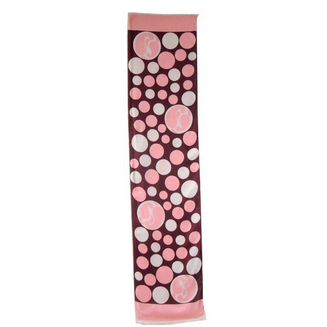 This scarf has hand rolled edges with a pink, maroon and white spot and paisley design and fringed edges.