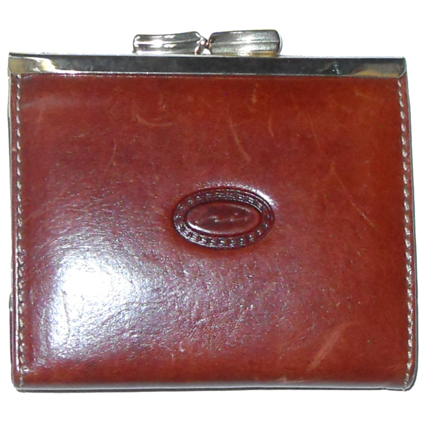 This cute retro leather purse has a gold tone clasp and an embossed emblem on the front. It has a dark brown fabric lining, divided into three pockets.