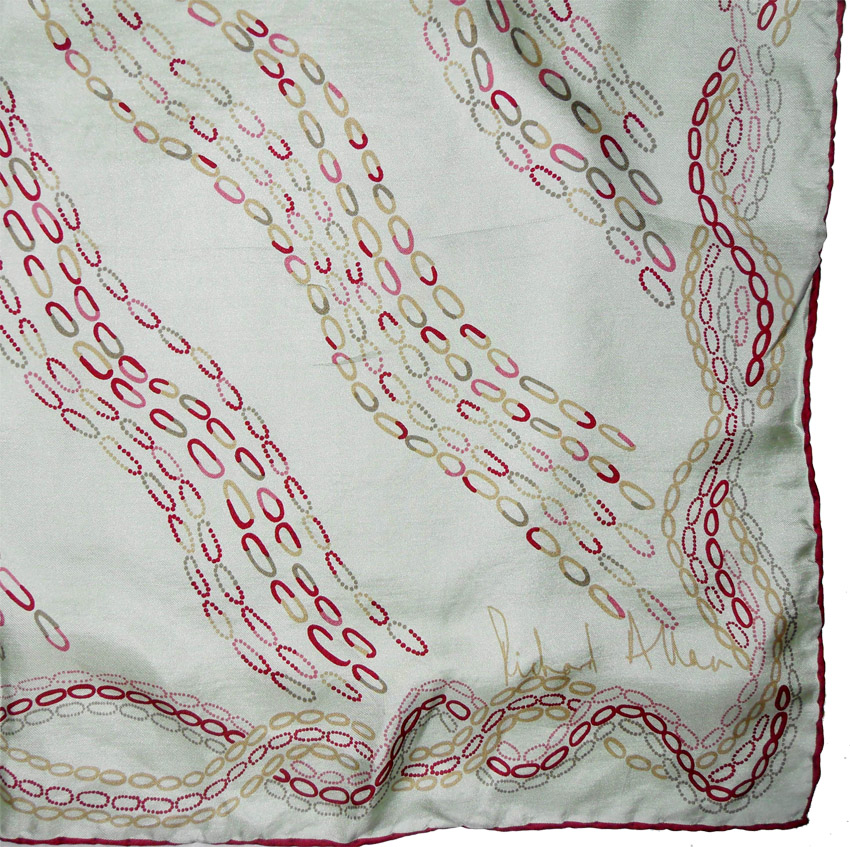 Richard Allan silk scarf with hand rolled edges, a pale green background and a design in dark red. Measures 28″ (71cm) x 29.5″ (75cm)