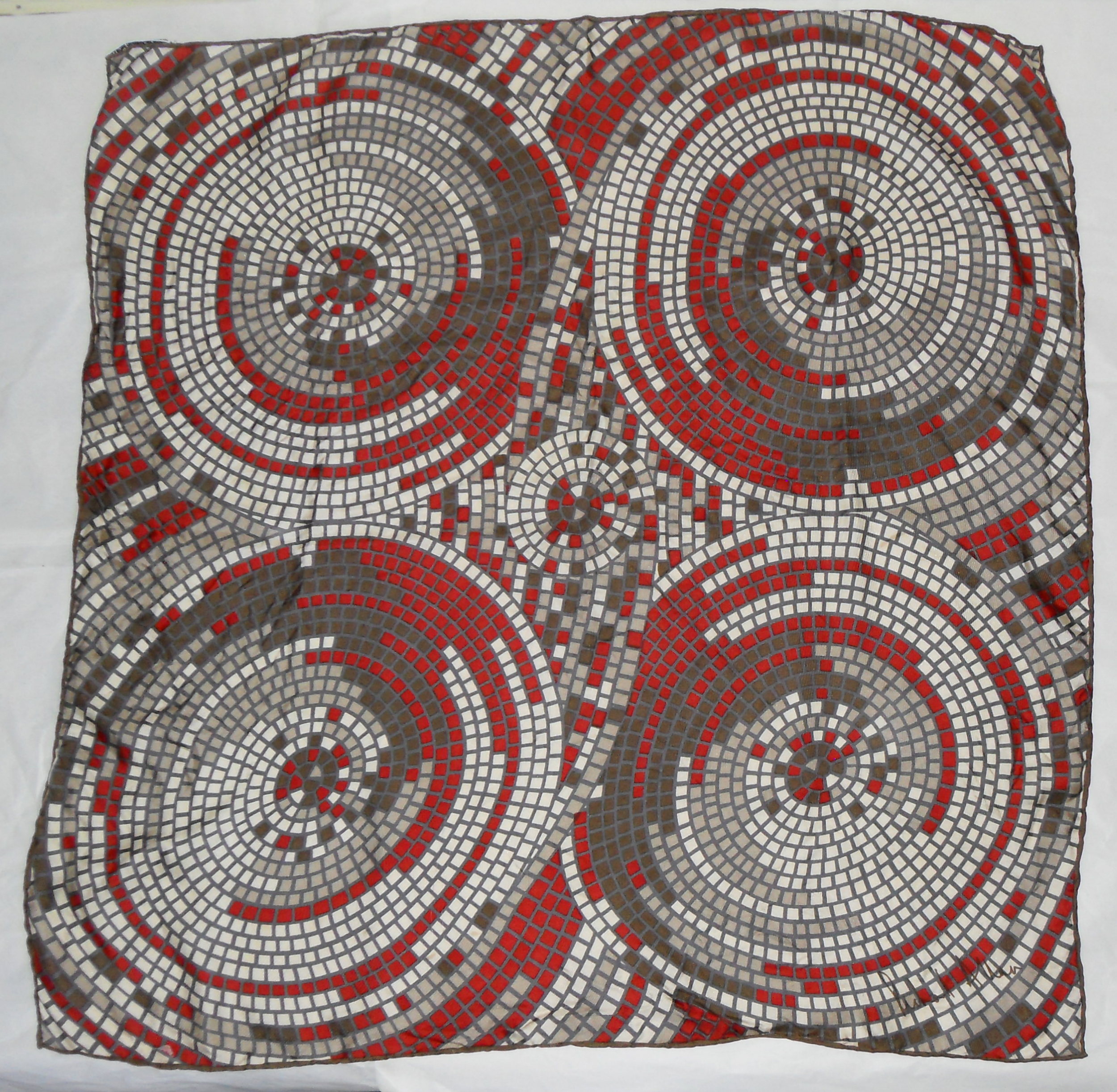 Vintage Richard Allan hand rolled edge silk scarf with a circle design made of squares in red and shades of grey. Measures 29″ (74cm) x 28″ (71cm).