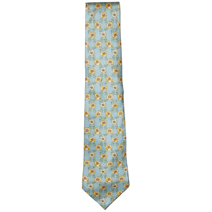 Yellow flower design silk tie on a pale blue background by Roderick Charles, London