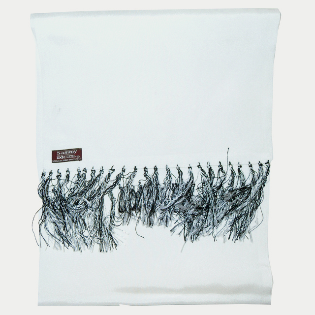 Sammy long white evening dress scarf with white and black tassels at each end.