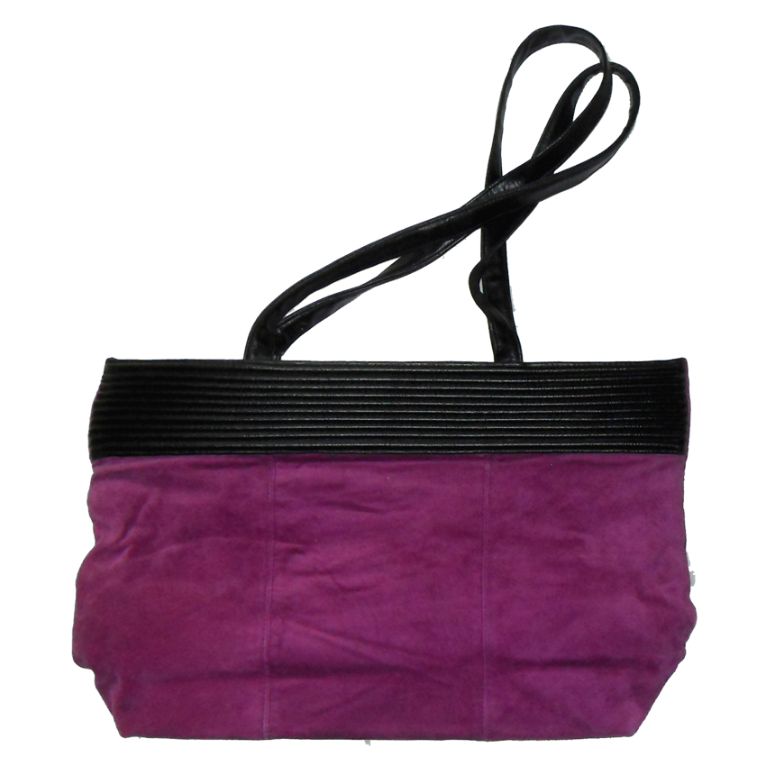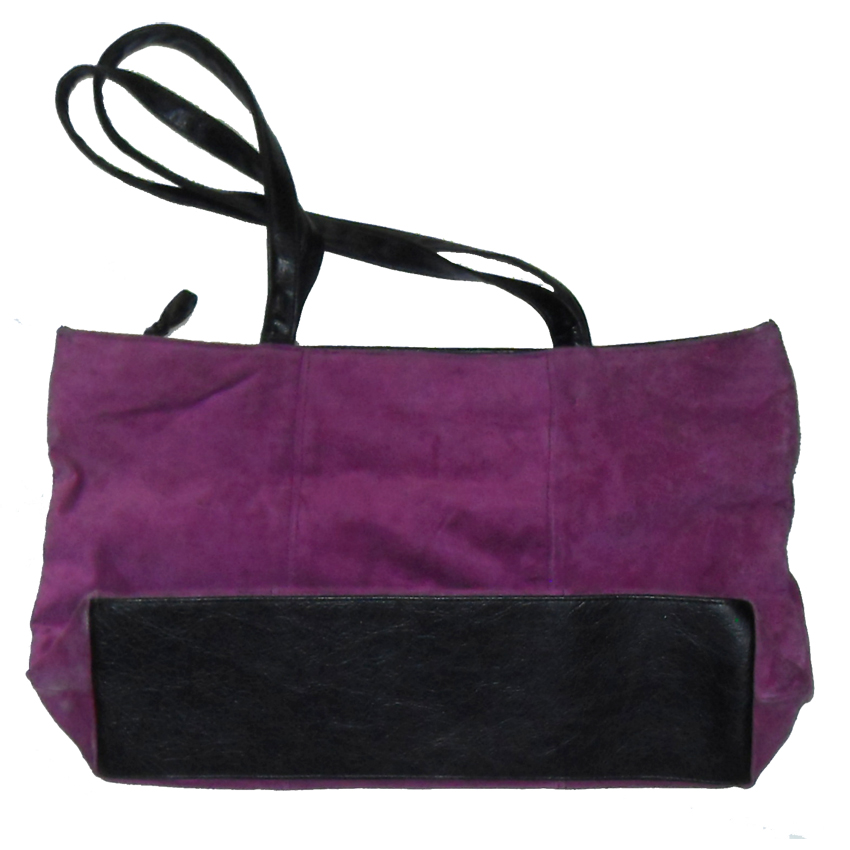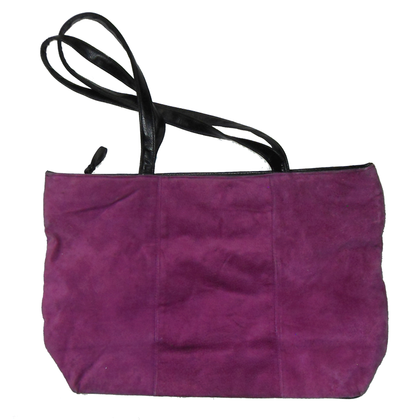 Retro purple suede tote bag with black leather detail at the front top and black leather carry straps. This bag is lined with black fabric and has a zip closure and a small zip pocket inside. Measures 15″ (38cm) x 11″ (28cm) without the straps.