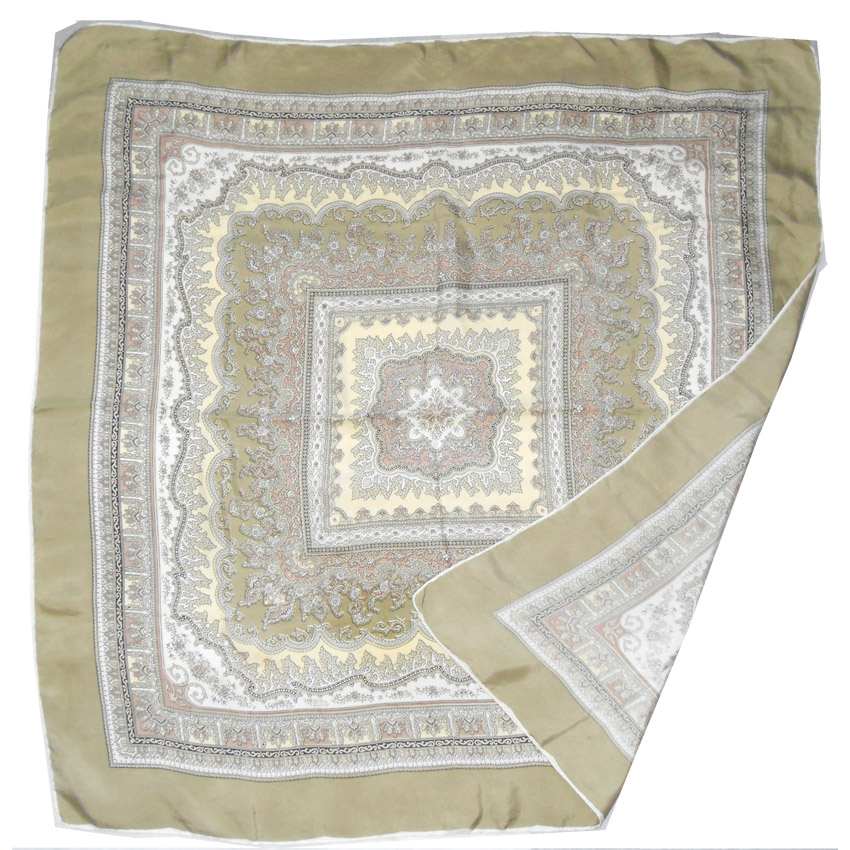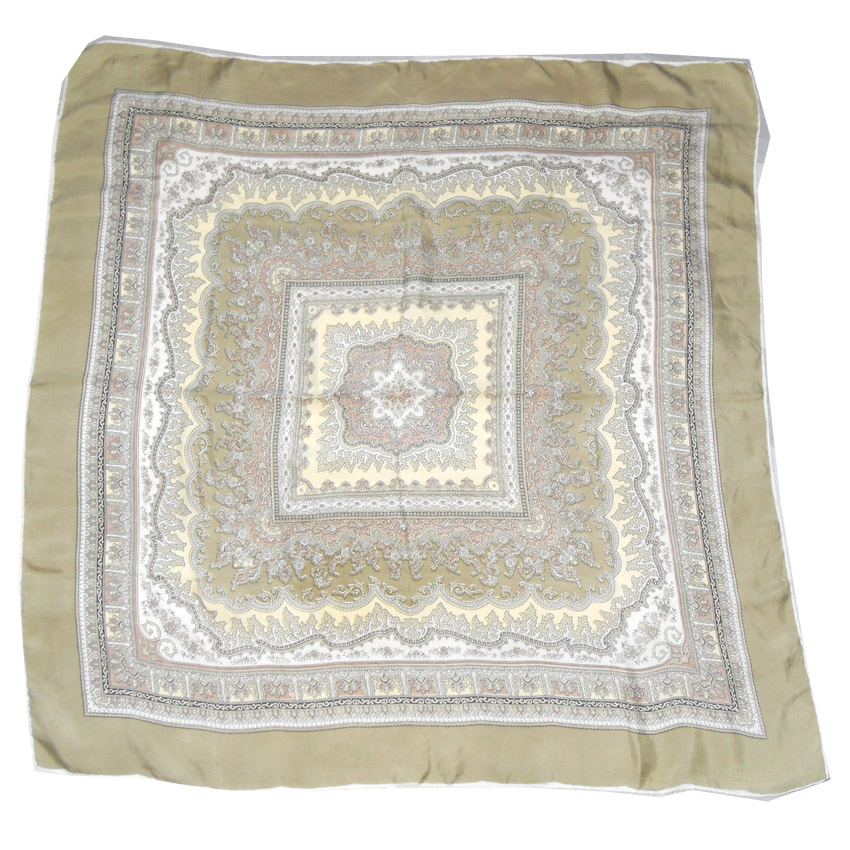 Silk scarf with a light olive border and a detailed central design in beige, light olive, black and white. This scarf has hand rolled edges and measures 35″ (89cm) x 34″ (86cm)