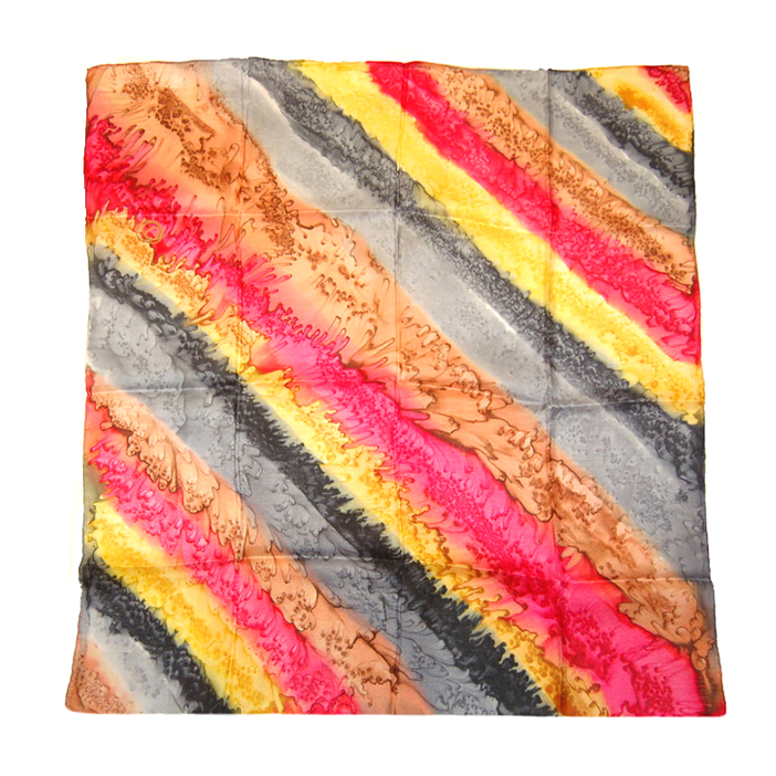 Hand rolled edged silk square with pink grey, brown and yellow washed through design measuring 21″ (54cm) x 21″ (54cm).