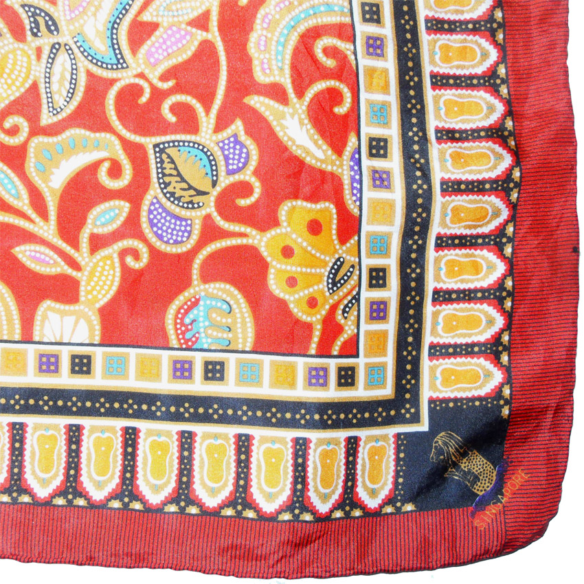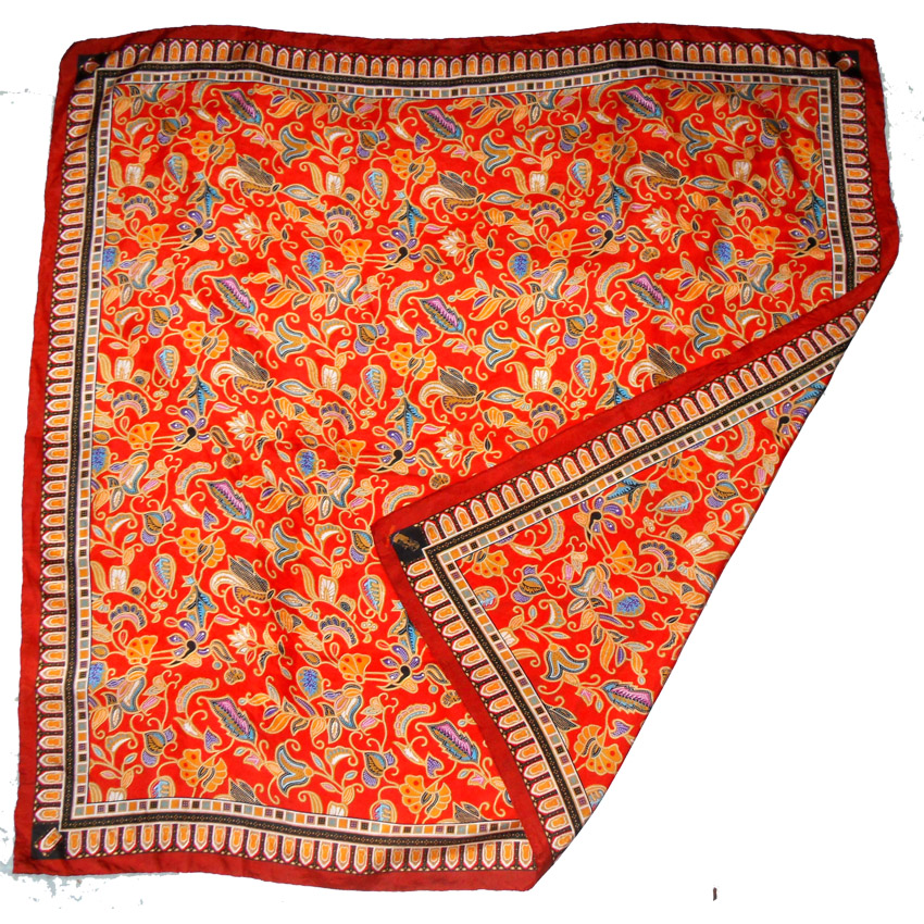 Hand rolled edge silk scarf with a red background and a vibrant colourful design and Singapore printed in the corner. Measures 42″ (107cm) x 41.5″ (105cm).
