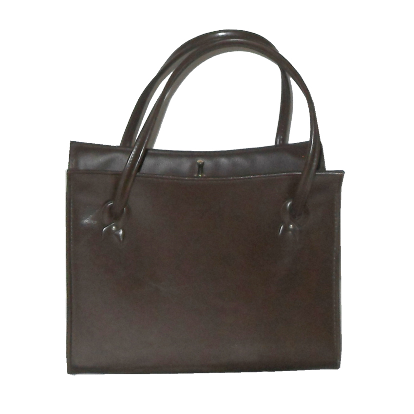 Vintage St Michael brown textured vinyl framed handbag with gold tone metal clasp and grosgrain fabric lining. Measures 9.5″ (18cm) wide x 7″ (24cm) without handles,