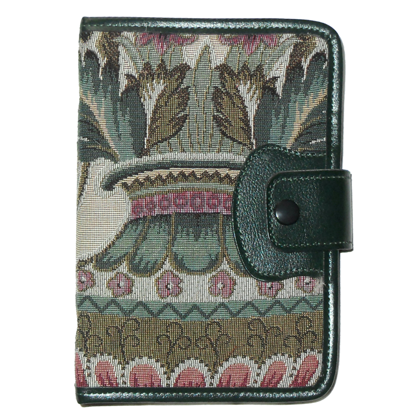 Green tapestry cover personal organiser which measures 5″ (13cm) aross x 7″ (18cm) high when closed.