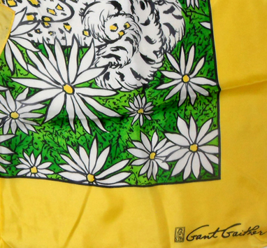 Gant Gaither Zoophisticates handrolled edge silk scarf with a design of a leopard and daisies on a vibrant green background with a bright yellow border. Measures 26″ (66cm) x 26″ (66cm).