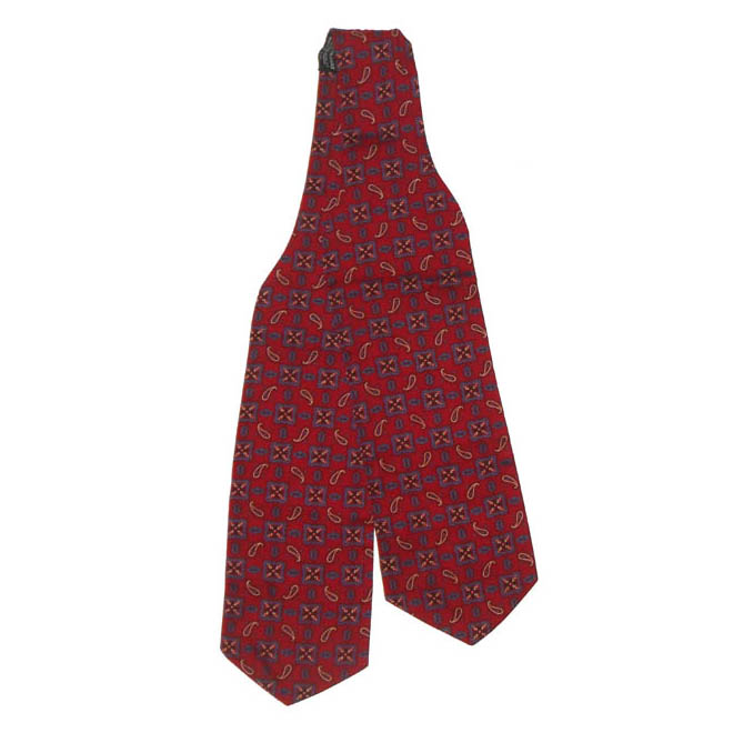 Tootal rayon cravat with a red background and a design in red, blues and white.