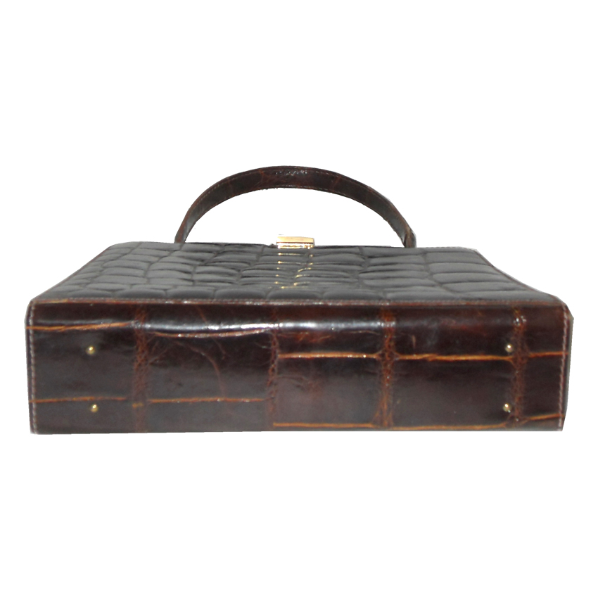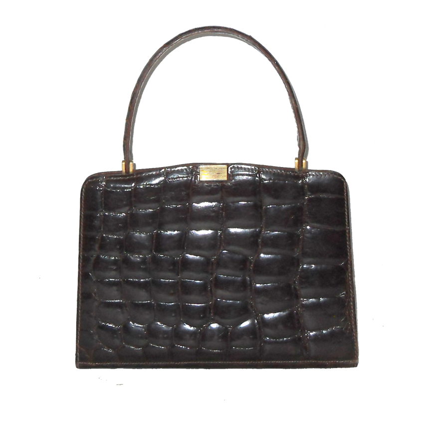 Vintage 1960s Triomphe, made in France exclusively for Macy’s New York crocodile skin framed handbag. This classic handbag is lined in brown leather and has one zip pocket and two small pockets inside. Measures 10.5″ (26cm) x 7″ (18cm) without handle.