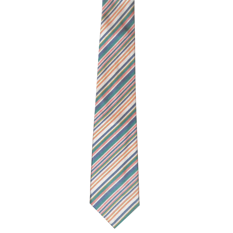 This elegant vintage silk satin tie has diagonal stripes in pink, green, blue, white and yellow. The name is repeated on the lining.