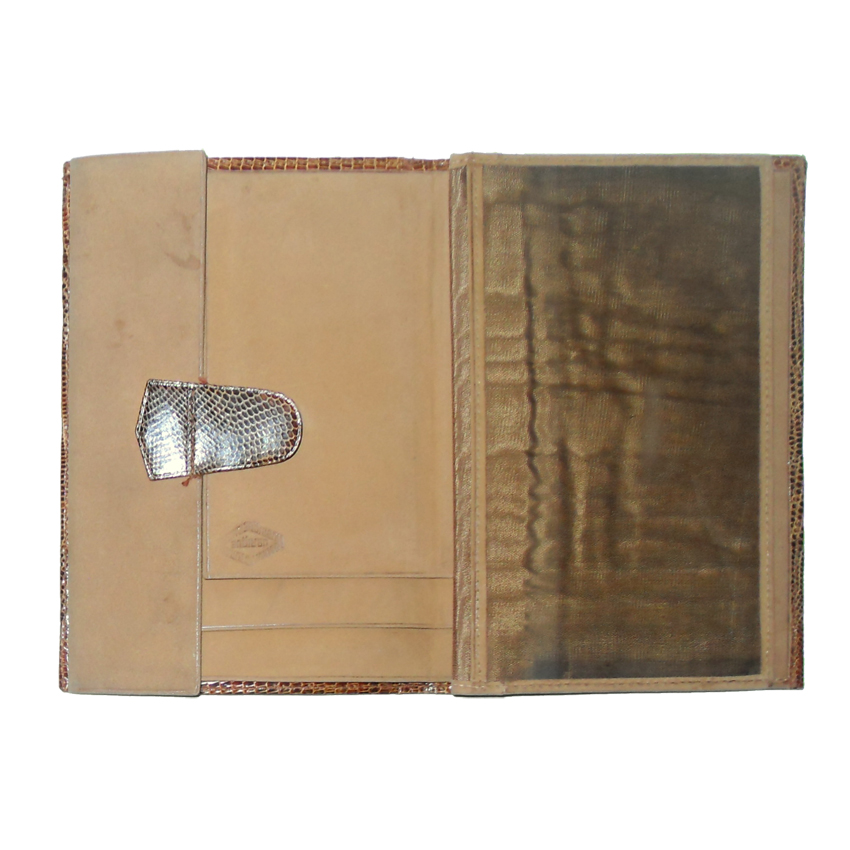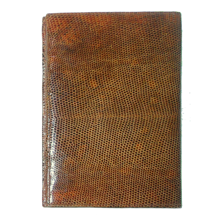 Ubrique lizard skin and nubuck wallet with a nubuck and moiré fabric interior. and numerous pockets for notes. Measures 6″ (15cm) x 4″ (10cm).