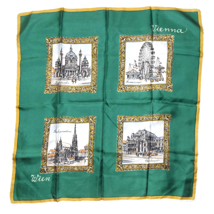 Hand rolled edge silk square with a green background depicting scenes from Vienna. Measures 22″ (56cm) x 22.5″ (57cm). Some small marks