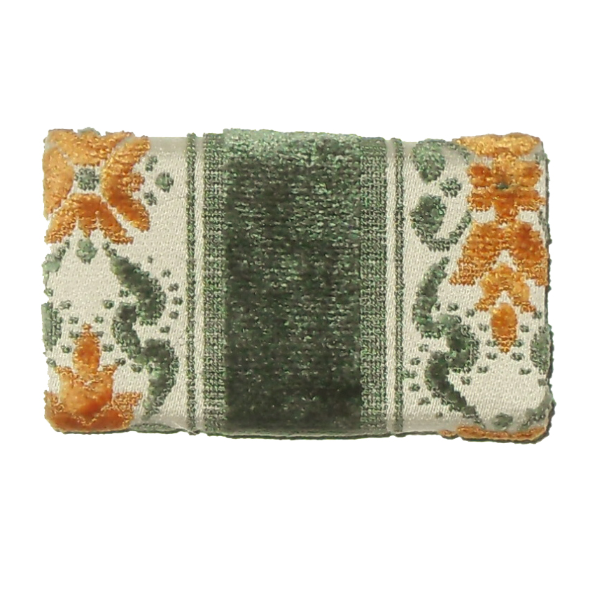 Italian key holder covered in a green, orange and cream fabric, lined with cream leather and with six goldtone metal key clasps. Measures 4” (10cm) x 2.5” (6cm).