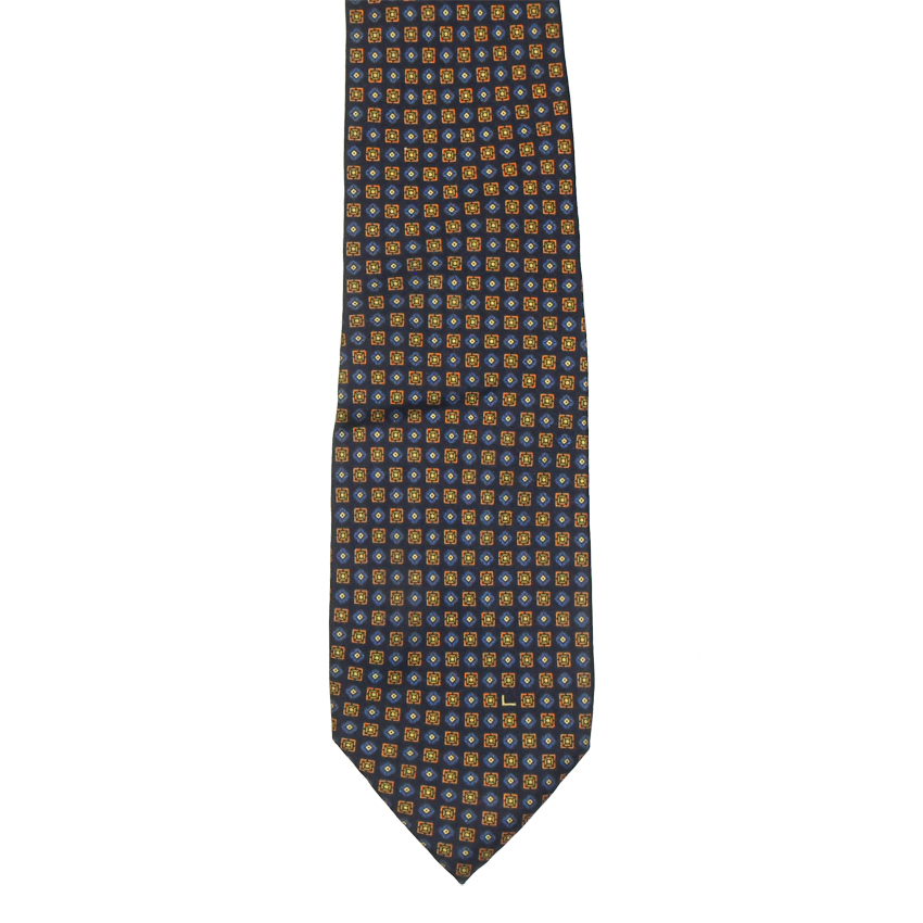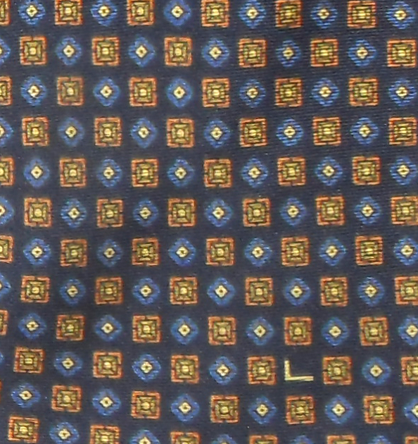 This sumptuous silk tie has a navy blue background and an orange square and blue diamond design.