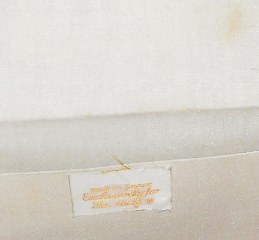 Vintage Mr Rolf, made in Japan, box handbag  with a wooden carry handle, lined in off white fabric with a small pocket inside.  Measures 9″ (23cm)  x 6″ (15cm) without handle.  There are some marks to the fabric lining.