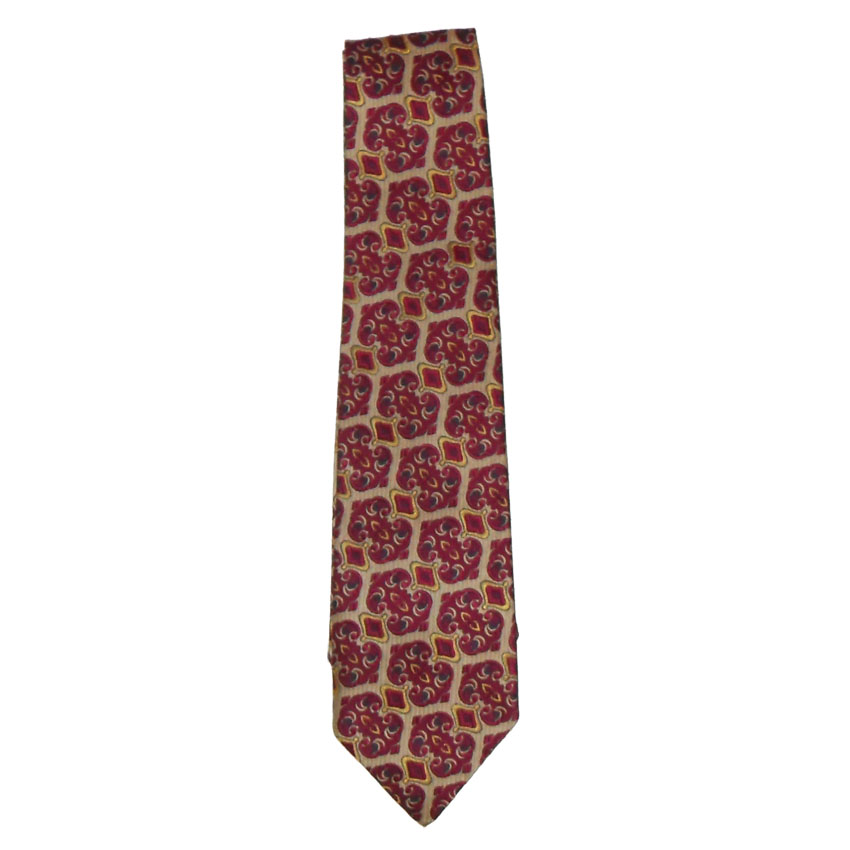 Vintage tie with a bright pink and yellow design on a cream textured background.