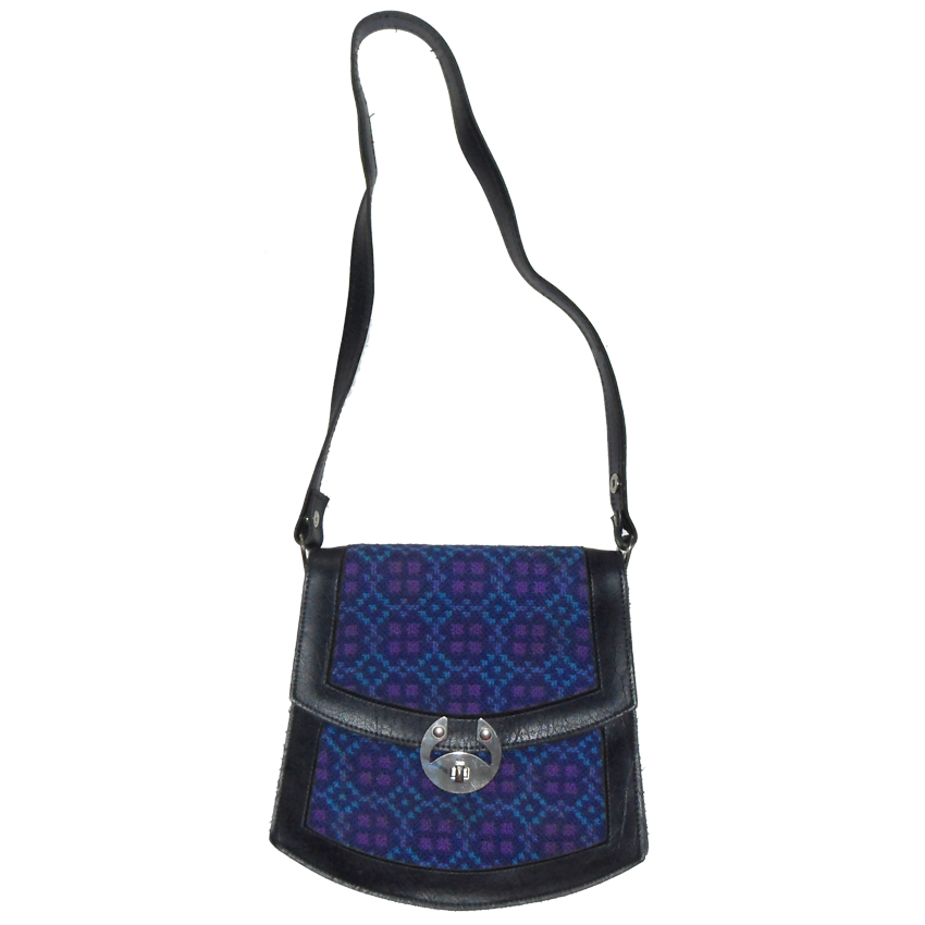 Vintage tapestry bag with blue and purple tapestry detail on the front with a gold tone clasp. This bag opens to reveal three large pockets and two smaller ones.