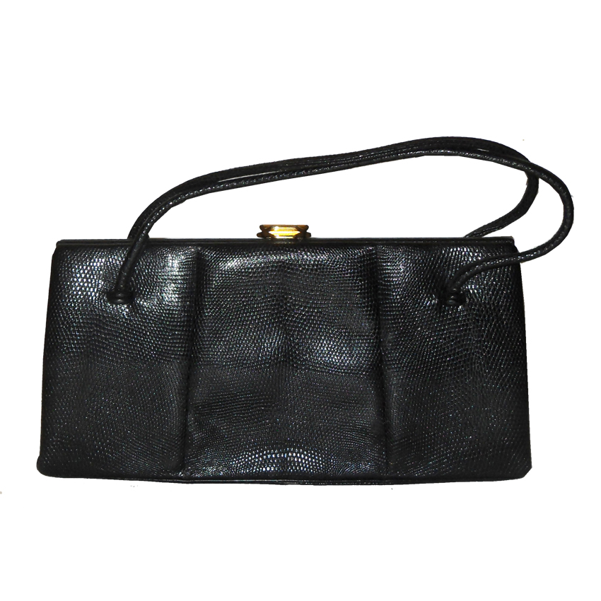 Vintage Waldybag black grained leather large framed handbag with suede lining. Inside there is a large zip pocket inside and several small pockets. Measures 13″ (33cm) x 6.5″ (16.5cm) without handle. Some wear to the bottom corners of the handbag.