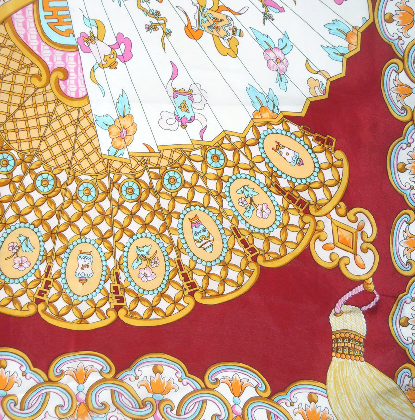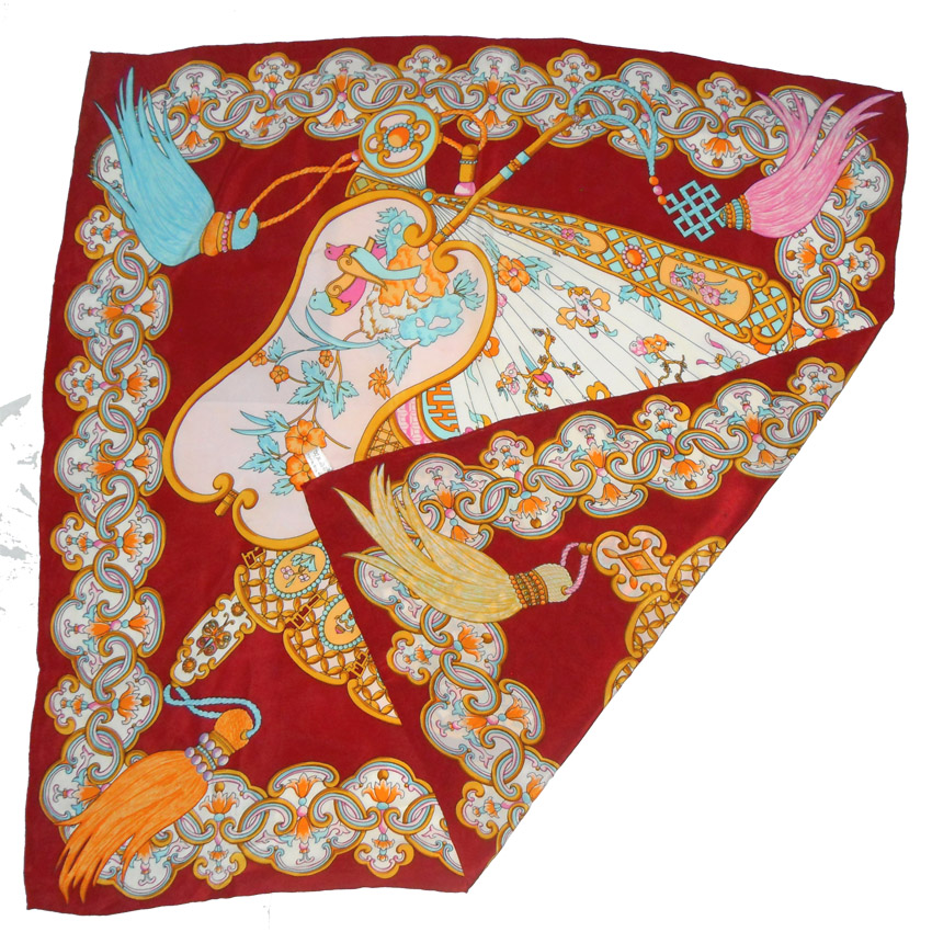 Xiang Mei silk scarf with hand rolled edges, a dark red border and a central design of fans in shades of pink, orange, gold and blue. Meausres 33″84cm) x 34″ (86cm)